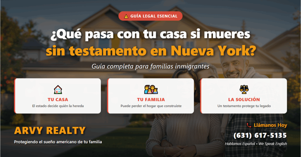 Si eres inmigrante viviendo en Nueva York—ya sea ciudadano, residente permanente, o incluso sin estatus legal—es crucial entender qué sucede con tu propiedad si falleces sin un testamento. En Arvy Realty, no solo te ayudamos a comprar tu casa, sino que también queremos que entiendas cómo proteger ese patrimonio para tu familia.